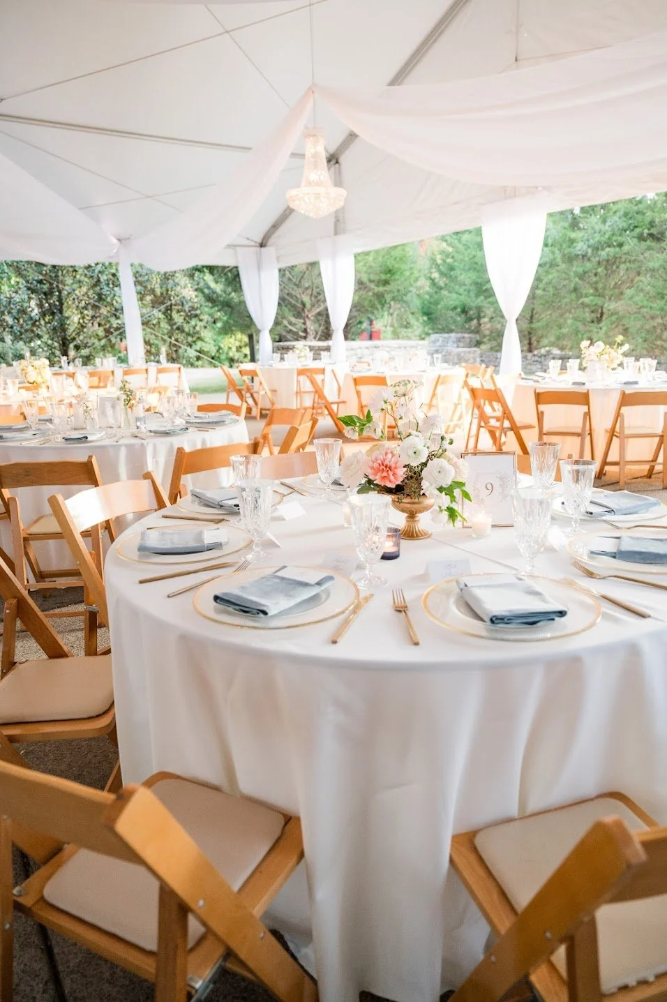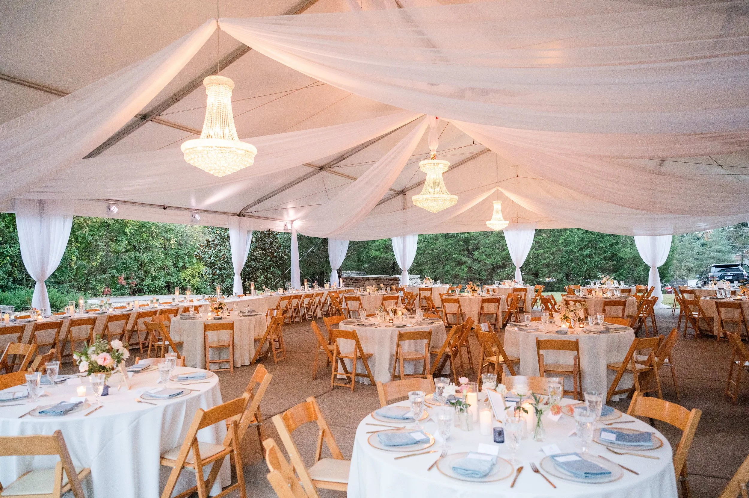 Full Ceiling Draping, Large Delphine Chandelier, String Lighting & Hour-Glass Pole Draping
